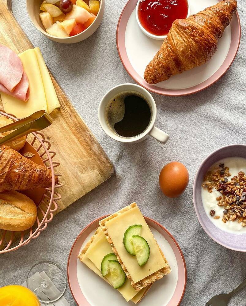 Pro Person inbegriffen: 2x Kaiserbrötchen, 1x Croissant, Zwieback, 1x b'tween Müsliriegel, 1x hartgekochtes Ei, 1x Obst, 1x Fruchtjoghurt 2x Scheiben Käse, 2 Scheiben Schinken oder Hähnchenbrust, Marmelade, Streusel, Butter 1x Orangensaft
